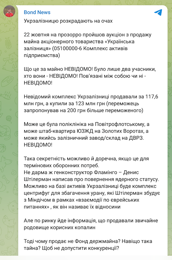 Нижче, ми публікуємо останній матеріал Володимира Бондаренка про "Укрзалізницю" - скріншот з Телеграм-каналу Bond News.