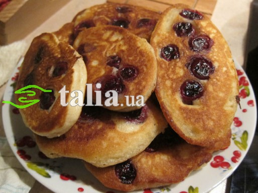 Сверху на каждый блин выложите несколько консервированных вишен без косточки (можно и размороженные).