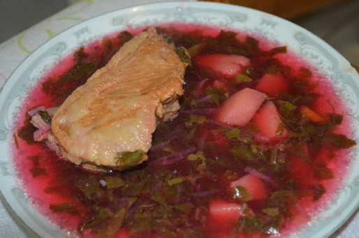 Мясо моем, режем порционными кусочками и заливаем холодной водой. Сразу солим и ставим на плиту. Когда начинает закипать, снимаем всю накипь. Потом варим на медленном огне до готовности мяса. Свеклу чистим моем и закладываем к мясу сваренному до полуготовности. Когда свекла сварится, достаём её из бульона.