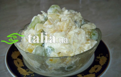 Соединяе всё вместе и заправляем майонезом смешанным с давленым чесночком.