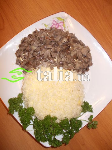 Салат выкладываем слоями в форме гриба, каждый слой смазываем майонезом: