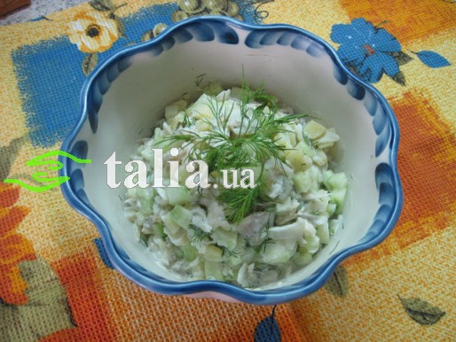 Все подготовленные продукты смешиваем, соли по вкусу и заправляем майонезом.