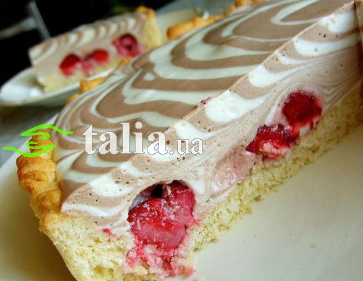 На дно охлажденного коржа выкладываем мелкие ягоды клубники и заливаем суфле поочередно: ложка белого, ложка темного.