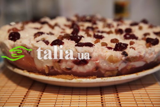 В тортницу на дно выкладываем арахис, вишни, изюм, кусочки банана. Потом столовой ложкой поверх накладываем нашу зефирную массу. И этой же ложкой хорошо перемешиваем массу с орехами и фруктами. Сверху, заливаем желатиновую массу и опять перемешиваем ложкой все, что есть в тортнице. Ставим на 3-4 часа в холод.