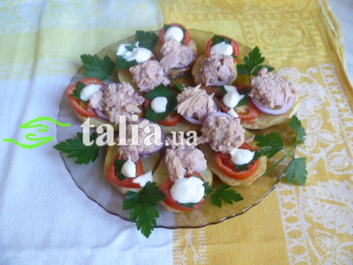 Готовые дольки смазываем немного майонезом, выкладываем кольцо красного лука и в него кладем 1 чайную ложку консервированного тунца.