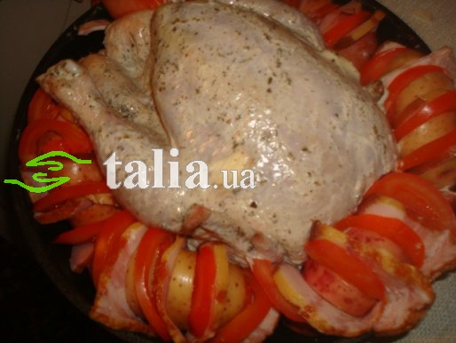 Talia: Куриную тушку промыть под проточной водой, натереть солью, черным молотым перцем, сухим базиликом и обмазать майонезом, как сверху так и в средине. Оставить мариноваться на 1 -2 часа. Нарезаем тонкими пластами помидоры и копченое сало.
